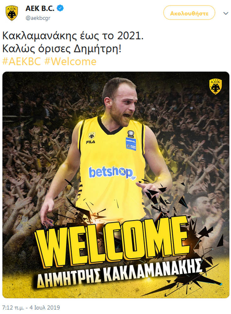 «Η ΑΕΚ ΒC ανακοινώνει, ότι συνήψε σήμερα (04/07) συμφωνία με τον Δημήτρη Κακλαμανάκη.