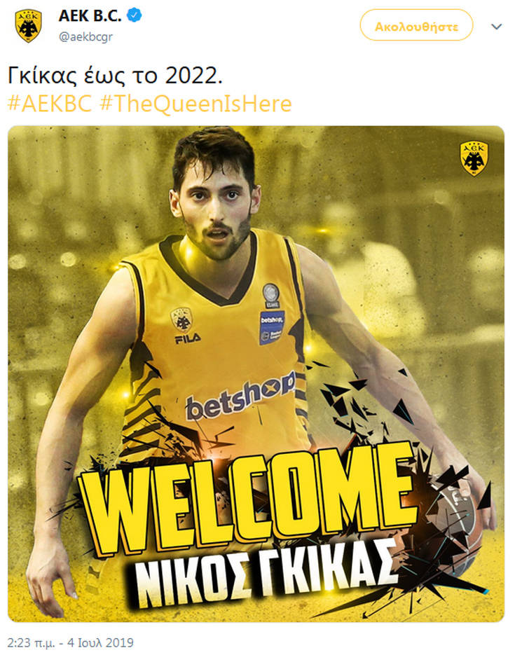 «Η ΑΕΚ ΒC βρίσκεται στην ευχάριστη θέση ν’ ανακοινώσει, ότι από σήμερα (04/07) εντάσσεται στο δυναμικό της ο Νίκος Γκίκας.