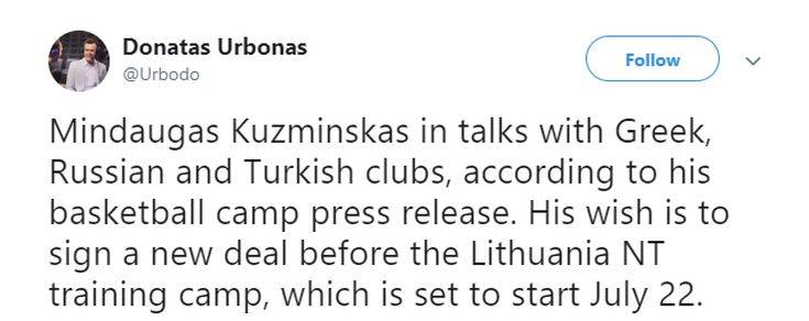 Η είδηση για τον Κουζμίνσκας είχε γίνει αρχικά γνωστή από τον συμπατριώτη του δημοσιογράφο, Ντονάτας Ούρμπονας, ο οποίος επικαλέστηκε επίσημη ανακοίνωση από το καμπ του παίκτη και αποκάλυψε ότι μιλά με ομάδες της Ελλάδας, της Ρωσίας και της Τουρκίας.