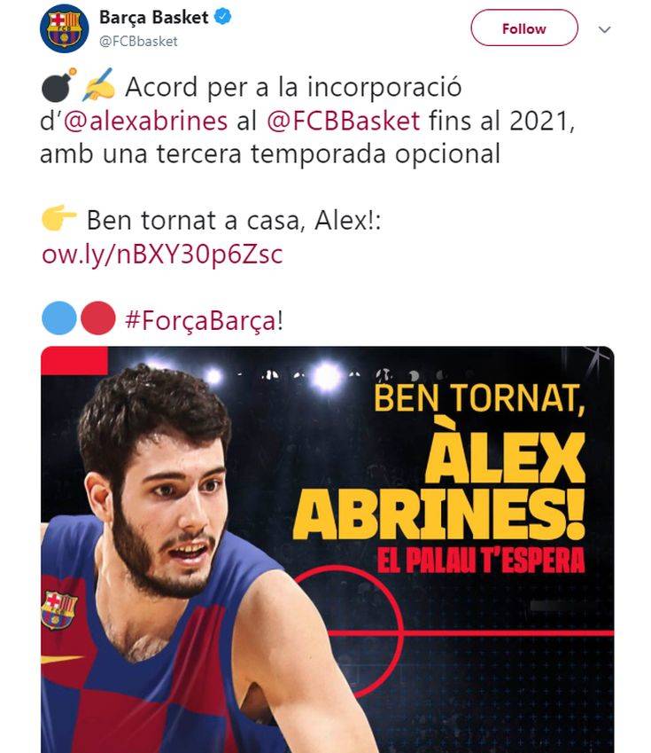 Ο Νίκολα Μίροτιτς δεν είναι ο μόνος διεθνής με την Ισπανία και πρώην παίκτης του ΝΒΑ που επιστρέφει στην ιβηρική χώρα για λογαριασμό της Μπαρτσελόνα. Πλέον, στο ρόστερ των «μπλαουγκράνα» προστίθεται και ο Άλεξ Αμπρίνες, ο οποίος έβαλε την υπογραφή του σε συμβόλαιο 2+1 ετών.