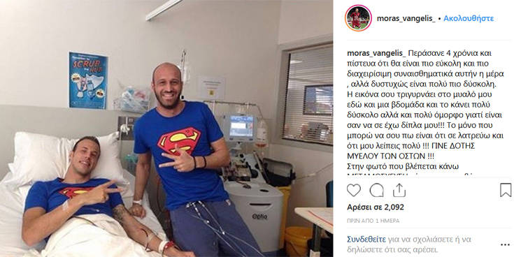 Ο Βαγγέλης Μόρας δημοσίευσε μια φωτογραφία με τον αδερφό του μέσα από το νοσοκομείο, την οποία συνόδευσε με την εξής λεζάντα: «Περάσανε 4 χρόνια και πίστευα ότι θα είναι πιο εύκολη και πιο διαχειρίσιμη συναισθηματικά αυτήν η μέρα, αλλά δυστυχώς είναι πολύ πιο δύσκολη. Η εικόνα σου τριγυρνάει στο μυαλό μου εδώ και μια βδομάδα και το κάνει πολύ δύσκολο, αλλά και πολύ όμορφο γιατί είναι σαν να σε έχω δίπλα μου!!! Το μόνο που μπορώ να σου πω είναι ότι σε λατρεύω και ότι μου λείπεις πολύ !!! ΓΙΝΕ ΔΟΤΗΣ ΜΥΕΛΟΥ ΤΩΝ ΟΣΤΩΝ !!! Στην φωτό που βλέπετε κάνω ΜΕΤΑΜΟΣΧΕΥΣΗ, όποτε μην φοβάστε απλά ενημερωθείτε σωστά».