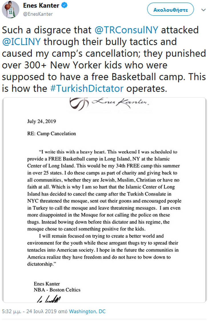 Με μήνυμά του στα social media ο 27χρονος μπασκετμπολίστας υποστηρίζει πως υπήρξαν απειλητικά μηνύματα από το τουρκικό προξενείο στη Νέα Υόρκη προς το «Islamic Center», που θα φιλοξενούσε το καμπ, ενώ εκφράζει και την απογοήτευσή για το γεγονός ότι δεν υπήρξε καταγγελία για το συμβάν στην Αστυνομία. Μάλιστα, στο μήνυμά του κάνει καταληκτικά λόγο για δικτατορία.