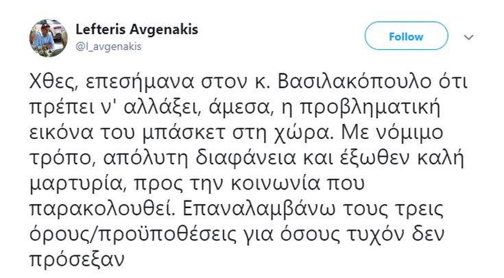 Η σχετική ανάρτηση αναφέρει: «Χθες, επεσήμανα στον κ. Βασιλακόπουλο ότι πρέπει ν’ αλλάξει, άμεσα, η προβληματική εικόνα του μπάσκετ στη χώρα. Με νόμιμο τρόπο, απόλυτη διαφάνεια και έξωθεν καλή μαρτυρία, προς την κοινωνία που παρακολουθεί. Επαναλαμβάνω τους τρεις όρους/προϋποθέσεις για όσους τυχόν δεν πρόσεξαν».
