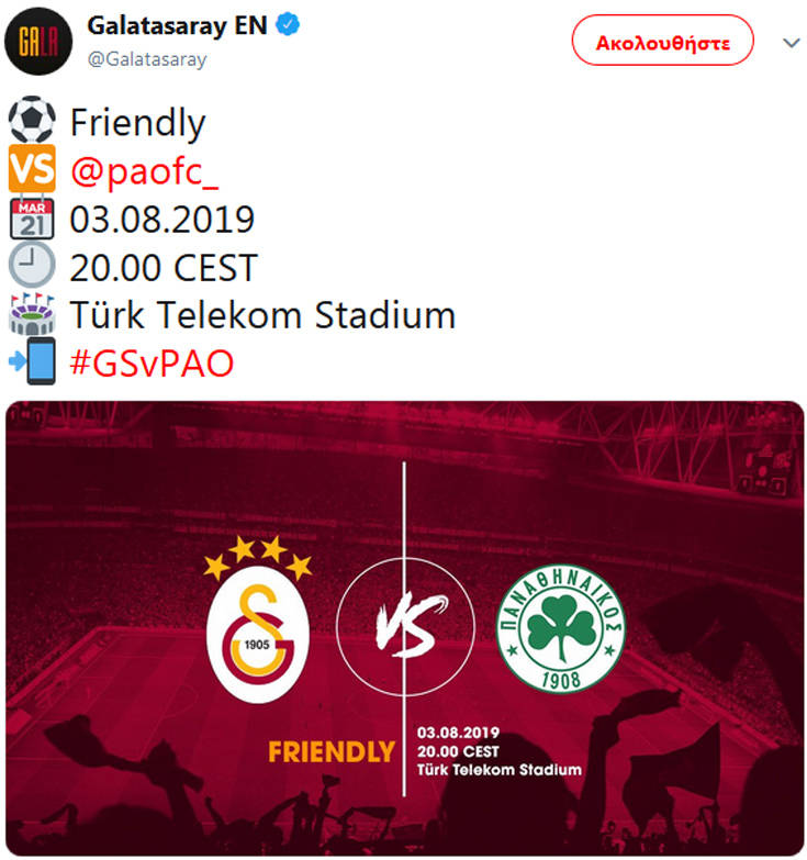 Πριν από αυτό όμως, το «τριφύλλι» θα δώσει ακόμα ένα φιλικό στη γειτονική χώρα, με την Γαλατάσαραϊ. Αυτό έκλεισε για το προσεχές Σάββατο, 3 Αυγούστου στην «Turk Telecom».