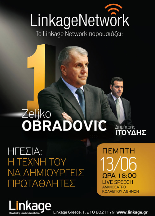 Ο Zeljko Obradovic και ο διαχρονικός, στενός συνεργάτης του Δημήτρης Ιτούδης θα αφηγηθούν – αποκλειστικά για την εκδήλωση – μαζί με ανέκδοτο υλικό, ιστορίες από αγώνες κι εμπειρίες τους στη διαχείριση κρίσιμων στιγμών, προσαρμόζοντας τις αθλητικές τους γνώσεις στις αρχές του management. Το Linkage Network φιλοξενεί την κορυφαία αθλητική προσωπικότητα του μπάσκετ, πλαισιωμένη από τους ηγέτες του ελληνικού επιχειρείν με στόχο να πραγματοποιήσουν μία διαφορετική συζήτηση για την ηγεσία! Η τεράστια παρακαταθήκη και η διεθνής επιρροή του Zeljko Obradovic θα αναδειχθούν σε αυτή την ξεχωριστή ομιλία στο Κολλέγιο Αθηνών συγκεντρώνοντας το ενδιαφέρον του επιχειρηματικού κόσμου.