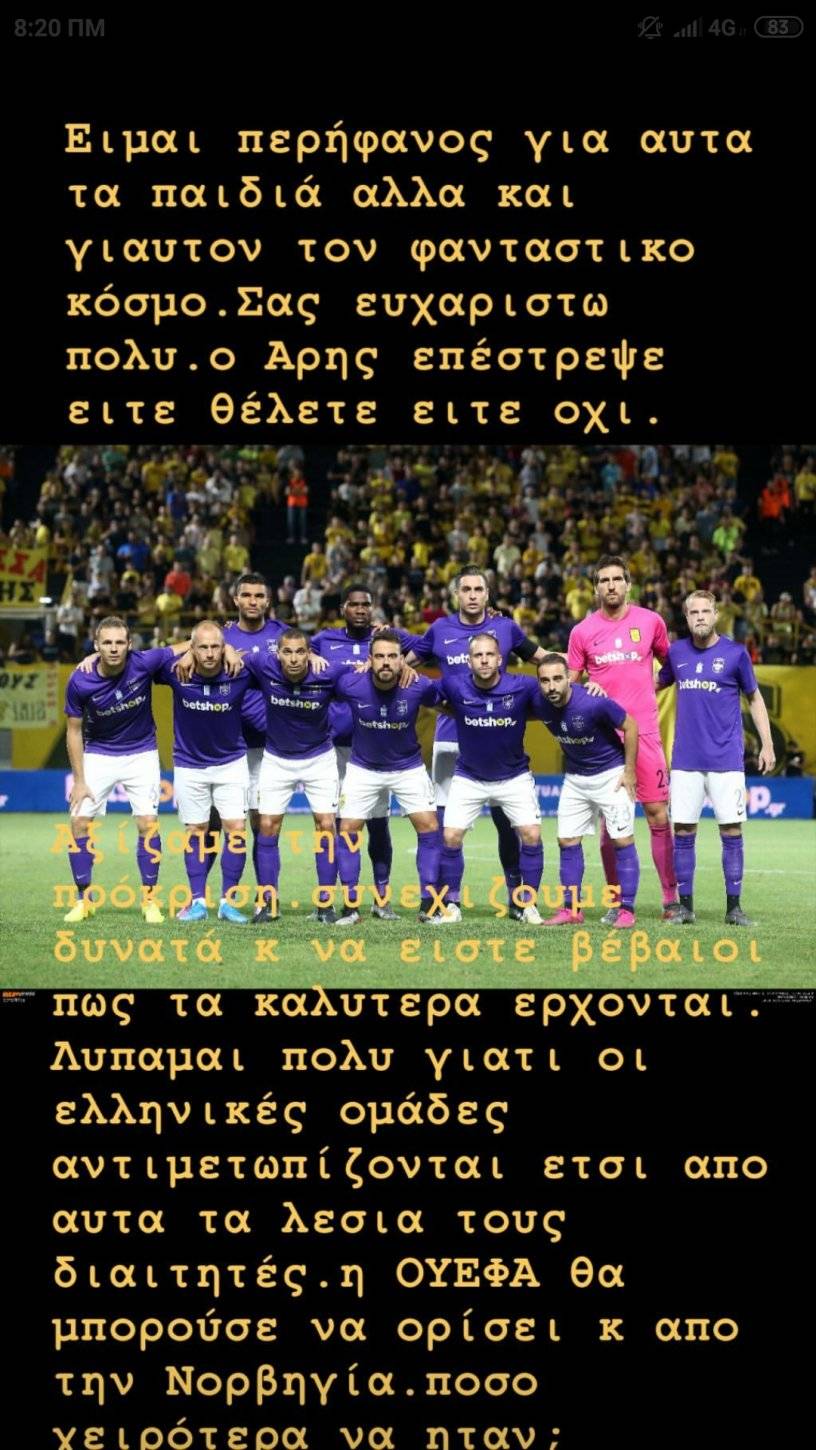 Περήφανος για την ομάδα του, έξαλλος για την διαιτησία. Ο ισχυρός άντρας του Άρη, Θοδωρής Καρυπίδης σχολίασε στο προσωπικό του λογαριασμό στο Instagram την υπερπροσπάθεια του Άρη κι αναφέρθηκε και στην διαιτησία του αγώνα μιας και είχε πολλά παράπονα από την διαιτησία του Ιρλανδού, Ρομπ Χάρβεϊ.