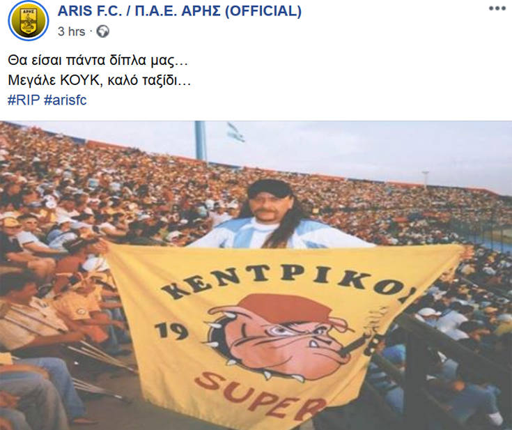 «Την Τετάρτη το βράδυ μανουριασες στο νοσοκομείο με τα σωληνάκια και τους ορους… “Πεστε τους να με αφήσουν φύγω από εδώ αύριο παίζει ο ΑΡΗΣ”… Πέμπτη πρωί έπεσες σε κώμα… Τελείωσε το παιχνίδι και μετά από λίγο έφυγες και εσυ… Σαν να το πάλευες και εσυ στην 3 μαζί με τον κόσμο και την ομάδα… Καλό ταξίδι γερο μου… Πάνε να χουλανδρισεις τους άλλους εκεί πάνω μέχρι να ερθουμε να σας βρούμε και εμείς… θα ζεις για πάντα στην καρδιά μας….