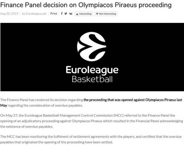 Έκτοτε, η Euroleague παρακολουθεί την πορεία των διακανονισμών που έχουν συμφωνηθεί μεταξύ Ολυμπιακού και παικτών και επιβεβαιώνει πως έχουν ακολουθηθεί πιστά όλα όσα είχαν συμφωνηθεί έχοντας καλύψει τις οφειλές που υπήρχαν».