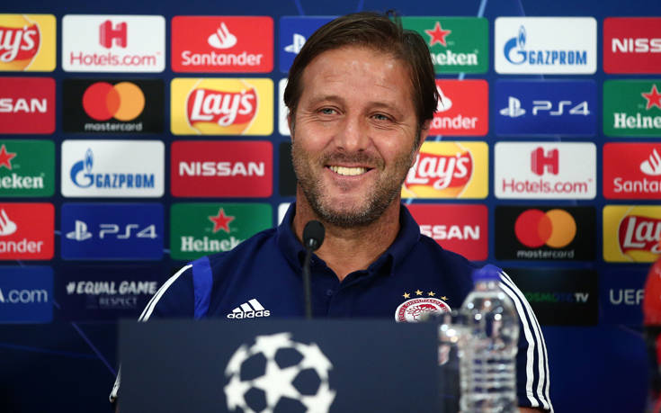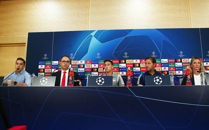 Τους ποδοσφαιριστές του Ολυμπιακού εκπροσώπησε ο Κώστας Τσιμίκας. Ο αριστερός μπακ των Πειραιωτών στάθηκε στην ψυχολογία που έχουν δώσει στην ομάδα οι δύο προκρίσεις με Βικτόρια Πλζεν και Μπασακσχεχίρ, ενώ στάθηκε και στον κόσμο της ομάδας, που δίνει πάντα δυναμικό «παρών» στο Καραϊσκάκη.