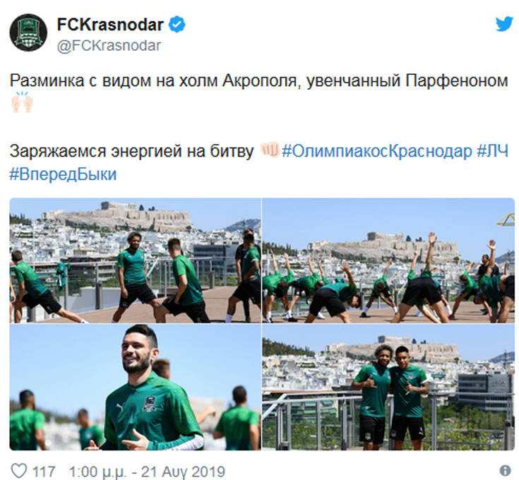 Λίγο πριν τη «μάχη» στο Φάληρο, οι Ρώσοι προπονήθηκαν με θέα την Ακρόπολη. «Ζέσταμα με θέα τον λόφο της Ακρόπολης, που “στέφεται” από τον Παρθενώνα. Γεμάτοι ενέργεια για τη μάχη», ανέφεραν στην ανάρτησή τους στα social media οι άνθρωποι της Κράσνονταρ.