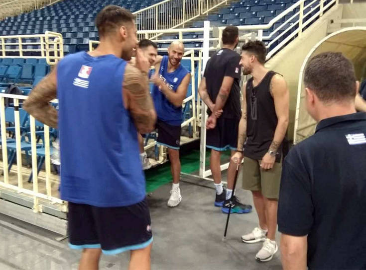 Νωρίς το μεσημέρι, πριν από την αναχώρηση των διεθνών για την Κίνα, ο 31χρονος άσος εμφανίσθηκε με πατερίτσες στην τελευταία προπόνηση επί ελληνικού εδάφους, μίλησε με τους συμπαίκτες του και τους ευχήθηκε ό,τι καλύτερο ενόψει της διοργάνωσης. Η κίνηση αυτή ήταν άκρως συγκινητική, η οποία δείχνει ταυτόχρονα το κλίμα συσπείρωσης που υπάρχει στις τάξεις της «γαλανόλευκης».