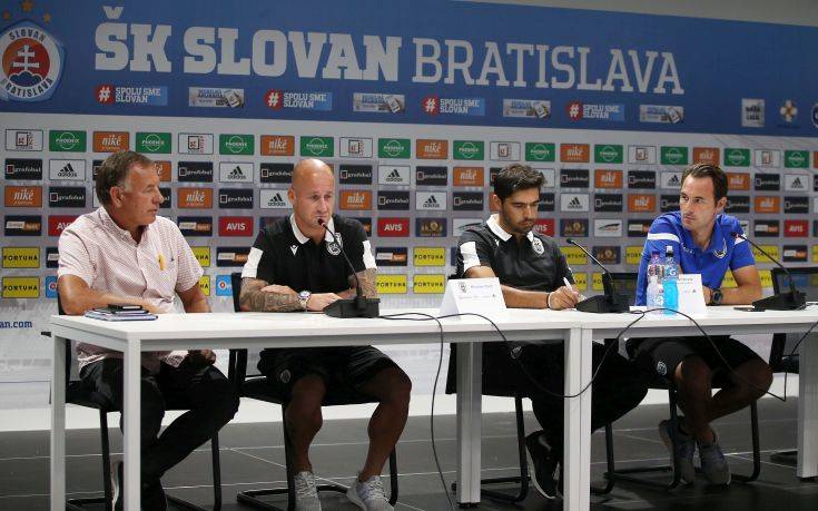 Τη διαχείριση μετά τον αποκλεισμό από τον Άγιαξ: «Αυτή η δυάδα αγώνων είναι στο παρελθόν. Στο παρόν μας προετοιμάζουμε το μέλλον μας. Η ιστορία των παιχνιδιών με τον Άγιαξ, πέρασε. Πλέον, είμαστε συγκεντρωμένοι στην τακτική προετοιμασία του παιχνιδιού με τη Σλόβαν. Είναι πολύ σημαντικό παιχνίδι για τον σύλλογο, και τους ποδοσφαιριστές, αλλά και για το ελληνικό ποδόσφαιρο. Θέλουμε να δείχνουμε την αξία μας σε ευρωπαϊκό επίπεδο. Θα πρέπει αύριο να είμαστε απόλυτα συγκεντρωμένοι και να δείξουμε μεγάλη επιθετικότητα στο γήπεδο».