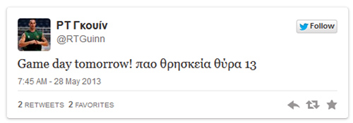 «Έχουμε αγώνα αύριο. ΠΑΟ, θρησκεία, θύρα 13», πόσταρε ο 31χρονος άσος στο Twitter γράφοντας το σύνθημα στα ελληνικά.