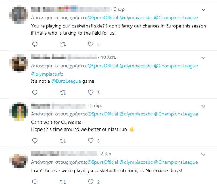 «Παίζουμε κόντρα σε ομάδα μπάσκετ απόψε, δεν υπάρχει καμία δικαιολογία παιδιά», αναφέρει ένα από τα ποστ των οπαδών της Τότεναμ στα σχόλια κάτω από το ποστ, ενώ ένα άλλο τονίζει: «Δεν δίνω πολλές ελπίδες στην ομάδα μου φέτος, αν κατεβάσουμε την ομάδα μπάσκετ στο ποδοσφαιρικό γήπεδο».