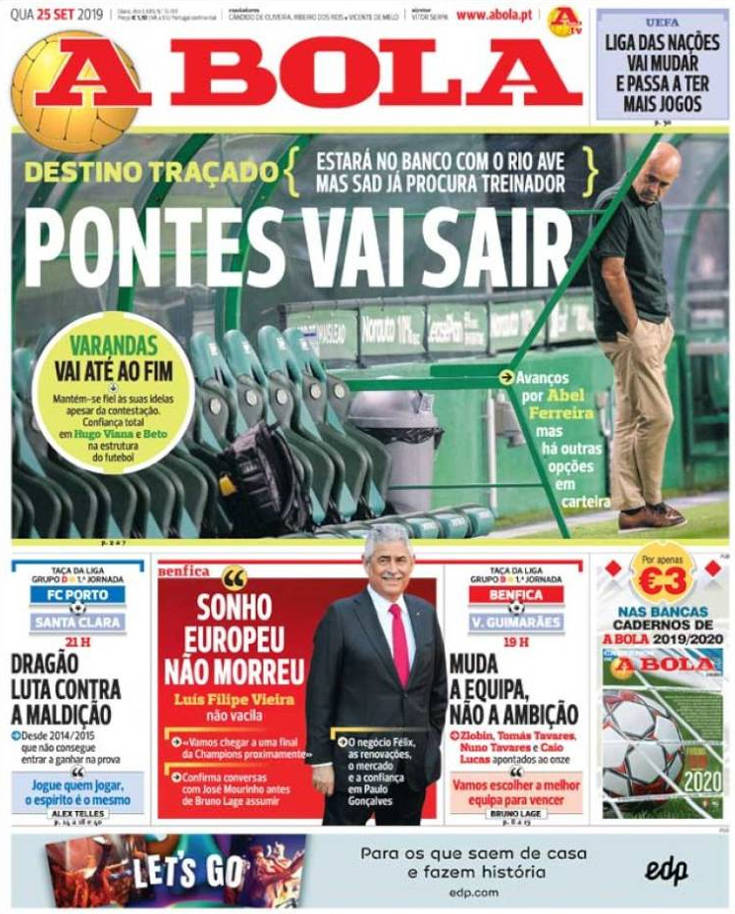 Τέλος, η A Bola, αναφέρει πως ο Πόντες αποχωρεί από τον πάγκο της Σπόρτινγκ και πως «η διοίκηση έχει ξεκινήσει επαφές για τον Αμπέλ Φερέιρα, ωστόσο στη λίστα υπάρχουν κι άλλες επιλογές».