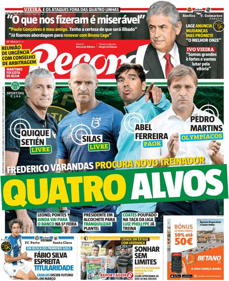 Από την πλευρά της, η Record παρουσιάζει τα τέσσερα ονόματα στη λίστα της Σπόρτινγκ, στα οποία περιλαμβάνει και αυτό του Μαρτίνς του Ολυμπιακού, ενώ τα άλλα τρία είναι του Φερέιρα, αλλά και των Κίκε Σετιέν και Σίλας Λίβρε.