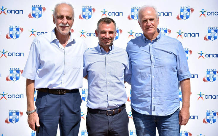 Βασίλης Σεβαστής (Γενικός Γραμματέας ΣΕΓΑΣ), Πάνος Γαβριήλ (Διευθυντής Εταιρικής Επικοινωνίας ΟΠΑΠ), Γιάννης Κουτσιώρας (Εθνικός Προπονητής ΣΕΓΑΣ)