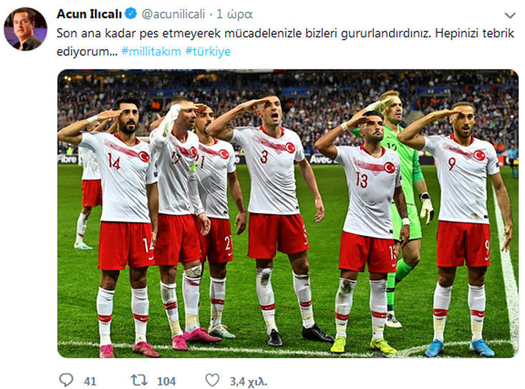 Ο Ατζούν Ιλιτζαλί συνεχάρη στους ποδοσφαιριστές της Εθνικής Τουρκίας για το 1-1 με την Γαλλία, ωστόσο επέλεξε να το κάνει με την φωτογραφία που τους δείχνει να χαιρετούν στρατιωτικά.
