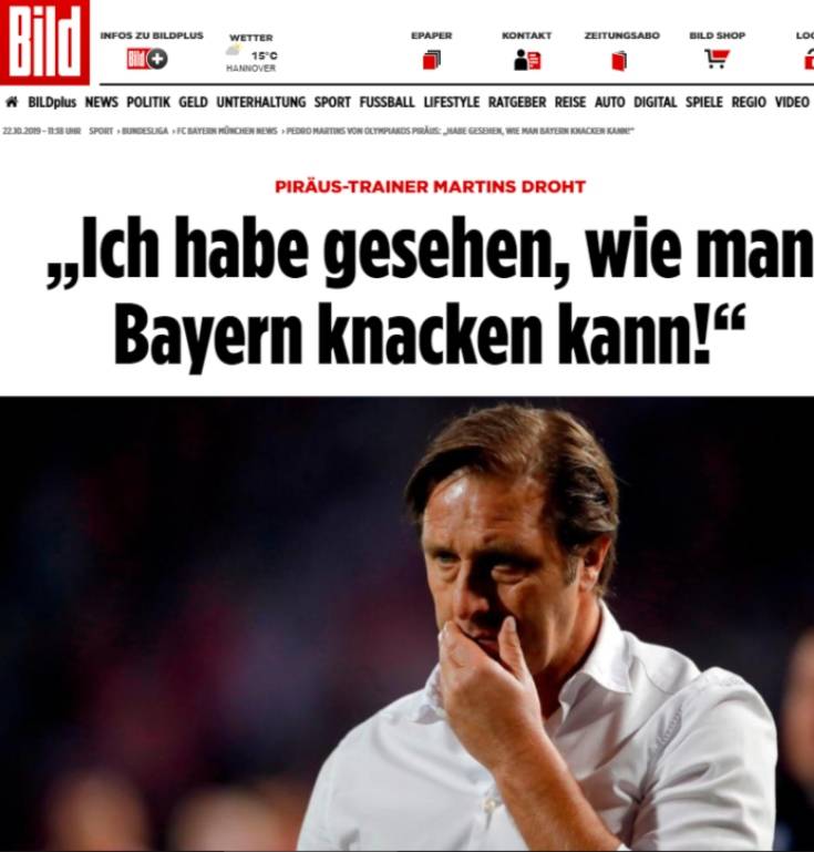 Συνέντευξη από τον προπονητή του Ολυμπιακού, Πέδρο Μαρτίνς, πήρε η γερμανική Βild ενόψει της αποψινής αναμέτρησης των «ερυθρολεύκων» με την Μπάγερν Μονάχου για την 3η αγωνιστική των ομίλων του Champions League.