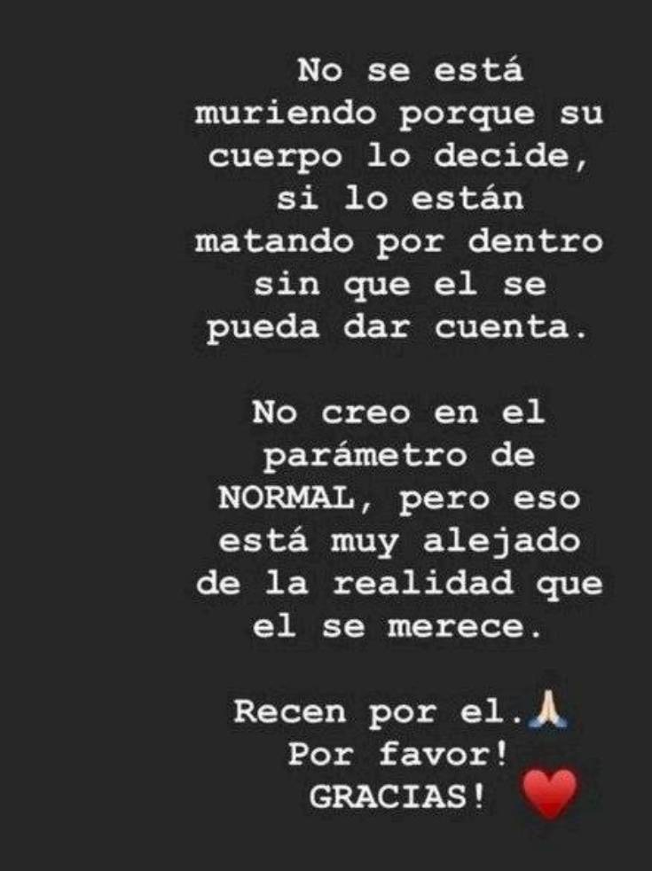Συγκεκριμένα μέσω των instagram stories η Τζιανίνα Μαραντόνα έγραψε:«Δεν πεθαίνει επειδή το σώμα του το έχει αποφασίσει, αλλά σκοτώνεται από μέσα του και δεν το έχει συνειδητοποιήσει. Δεν πιστεύω στις παραμέτρους του φυσιολογικού, αλλά αυτό απέχει πολύ από την πραγματικότητα που του αξίζει. Προσευχηθείτε γι’ αυτόν. Σας παρακαλώ. Σας ευχαριστώ».