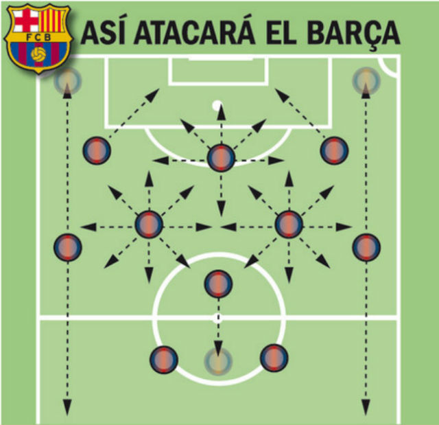 «Του αρέσουν οι παίκτες του να πιέζουν πάρα πολύ. Αν χάσουν την μπάλα τους ζητά να τρέξουν γρήγορα για να κερδίσουν και πάλι τη μπάλα όσο το δυνατόν το γρηγορότερο. Τα τελευταία χρόνια αυτό είχε χαθεί στην Μπαρτσελόνα, τουλάχιστον έτσι όπως το εφάρμοσε ο Γκουαρντιόλα με επιθετικούς του Μέσι, Ανρί και Ετό. Αυτοί οι τρεις αποτελούσαν την πρώτη γραμμή πίεσης, η οποία εφαρμοζόταν από τη μεγάλη περιοχή του αντιπάλου», τόνισε και επεσήμανε ότι στην επίθεση του αρέσει να δίνει μεγάλη ελευθερία στους επιθετικούς του με τους οποίους προσπαθεί να εφαρμόσει το «false 9»