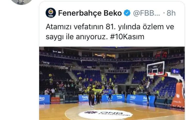 Οι παίκτες της Φενέρμπαχτσε μπήκαν στην Ulker Sports Arena κρατώντας ένα πανό για τα 81 χρόνια από τον θάνατο του Κεμάλ Ατατούρκ, το οποίο δεν ακούμπησε ο Κώστας Σλούκας.