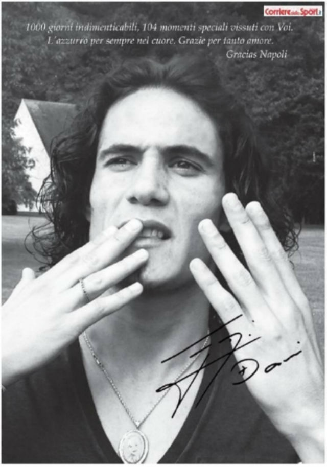 Ένα ολοσέλιδο «ευχαριστώ» του Έντινσον Καβάνι φιλοξένησε η «Corriere dello Sport».Με μια εξωαγωνιστική φωτογραφία του εαυτού του, το αυτόγραφό του και λίγα λόγια στα ιταλικά, ο Έντινσον Καβάνι ευχαρίστησε τους οπαδούς της πρώην ομάδας του, Νάπολι, για όσα έζησε στο «Σαν Πάολο».