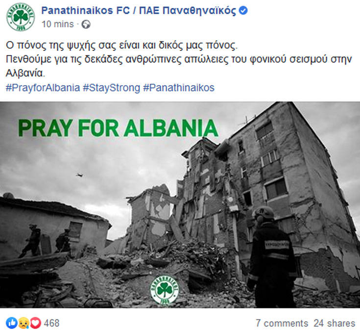 Ο Παναθηναϊκός θέλησε να σταθεί στο πλευρό των πληγέντων από τον φονικό σεισμό της Αλβανίας.