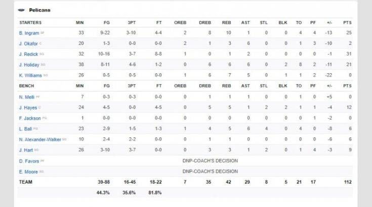 Οι Μπακς με την άνετη σημερινή επικράτηση έφτασαν τους Λέικερς στην κορυφή του NBA με 22-3 και κυρίως έδειξαν πως έχουν ομάδα και πως δεν τα περιμένουν όλα από τον MVP της περσινής χρονιάς. Στα του αγώνα οι γηπεδούχοι κέρδισαν ακόμα πιο άνετα από όσο δείχνει το τελικό σκορ, με την διαφορά να φτάνει και τους 30. Στο τέλος οι φιλοξενούμενοι προσπάθησαν να αντιδράσουν, αλλά ήταν τέτοια η διαφορά δυναμικότητας που οι Μπακς δεν τους άφησε το παραμικρό περιθώριο αντίδρασης και έτσι οι Πέλικανς έπεσαν στο 6-19.