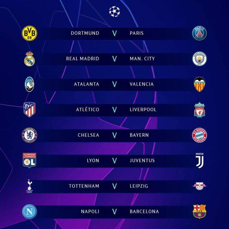 Συγκεκριμένα, η κληρωτίδα έβγαλε τις μεγάλες μονομαχίες Μπορούσια Ντόρτμουντ-Παρί Σεν Ζερμέν, Ρεάλ Μαδρίτης-Μάντσεστερ Σίτι, Ατλέτικο Μαδρίτης-Λίβερπουλ, Τσέλσι-Μπάγερν Μονάχου, αλλά και το Νάπολι-Μπαρτσελόνα. Επίσης, αμφίρροπα μοιάζουν και τα παιχνίδια Αταλάντα-Βαλένθια και Τότεναμ-Λειψία, ενώ η Γιουβέντους μπορεί να θεωρηθεί το μόνο μεγάλο φαβορί μπορεί να θεωρηθεί η Γιουβέντους με αντίπαλο τη Λυών.