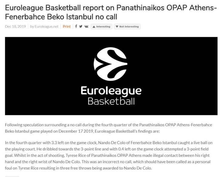 Θέση για την τελευταία φάση του αγώνα μεταξύ του Παναθηναϊκού και της Φενέρμπαχτσε, στα πλαίσια της 14ης αγωνιστικής της διοργάνωσης πήρε επισήμως η Euroleague.