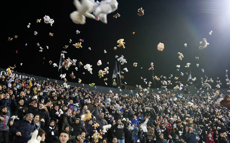 Στο γήπεδο έπεσαν σαν καταιγίδα λούτρινα αρκουδάκια, τα οποία συμβόλιζαν ένα χρηματικό ποσό το οποίο θα πάει σε ιδρύματα με παιδιά.