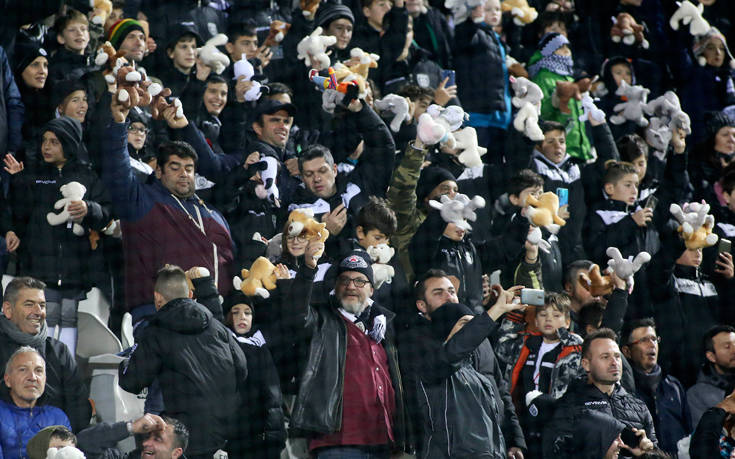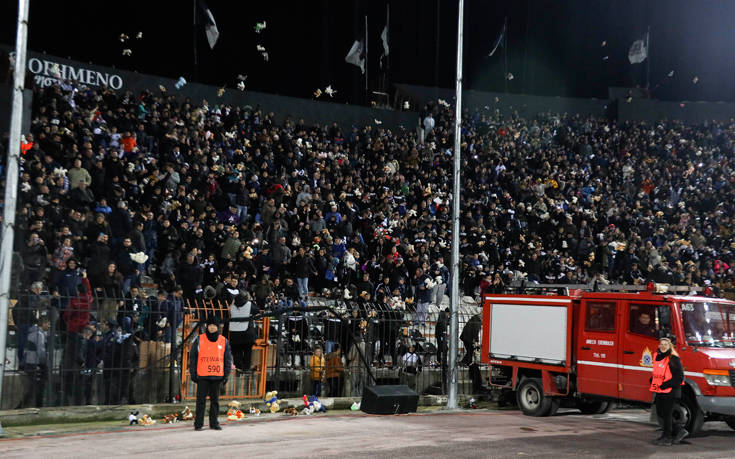 Οι παίκτες των δύο ομάδων πήγαν στις θύρες 7-8 με αρκουδάκια στα χέρια και τα πέταξαν προς την εξέδρα, ενώ στην ίδια κίνηση προχώρησαν και όσοι βρέθηκαν στο γήπεδο.