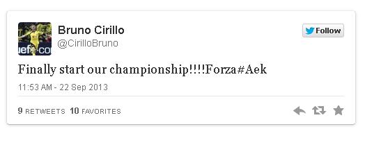 «Επιτέλους αρχίζει το πρωτάθλημα. Πάμε ΑΕΚ», έγραψε στο Twitter ο Ιταλός αμυντικός.