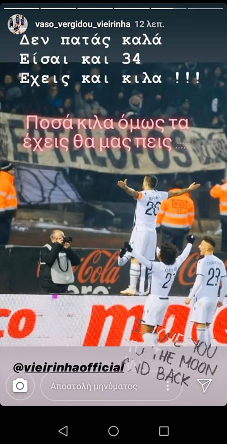 Η γυναίκα του Πορτογάλου άσου, Βάσω Βεργίδου, αποθέωσε τον σύζυγό της με μια ανάρτησή της στο Instagram, στην οποία έβαλε τη φωτογραφία από τον πανηγυρισμό του μετά το τέρμα που σημείωσε και τη συνόδευσε με την εξής λεζάντα: «Δεν πατάς καλά. Είσαι και 34. Έχεις και κιλά!!! Πόσα κιλά όμως τα έχεις θα μας πεις;;;».