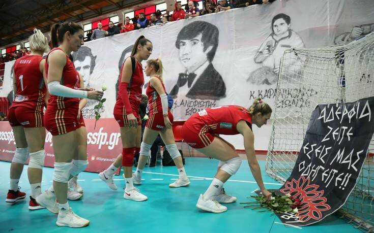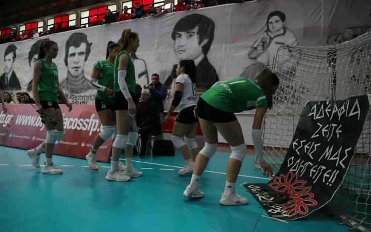 Αυτό το μήνυμα έστειλαν και οι γυναικείες ομάδες βόλεϊ των Ολυμπιακού και Παναθηναϊκού, τιμώντας τη μνήμη των 21 θυμάτων της τραγωδίας, πριν την έναρξη του μεταξύ τους ντέρμπι.