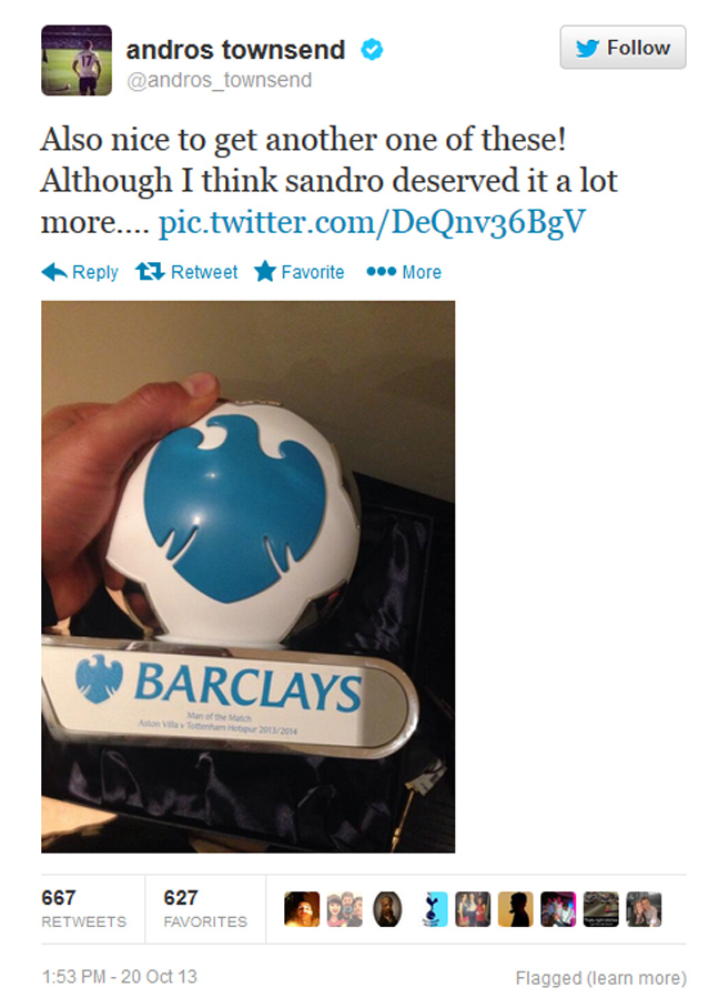 Την άποψη ότι ο Σάντρο έπρεπε να πάρει το βραβείο του MVP στη χθεσινή νίκη της Τότεναμ επί της Άστον Βίλα εξέφρασε ο Άντρος Τάουνσεντ, μέσω σχολίου που ανάρτησε στο Twitter.