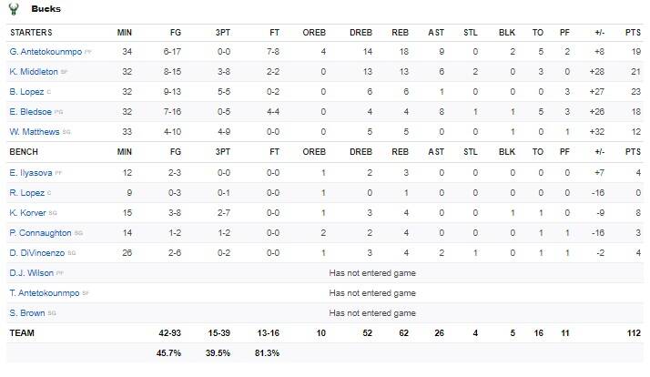 Άξιοι συμπαραστάτες του Γιάννη ήταν οι Λόπεζ, Μίντλετον και Μπλέντσο με 23, 21 και 18 πόντους αντίστοιχα, φτάνοντας το ρεκόρ των «ελαφιών» στο 45-7.