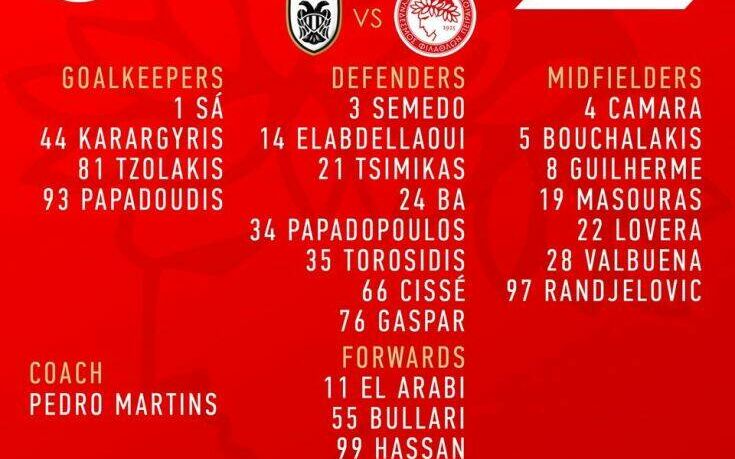Οι «εκλεκτοί» του Πορτογάλου προπονητή είναι οι Μπα, Μπουχαλάκης, Μπουλάρι, Σισέ, Ελ Αραμπί, Ελαμπντελαουί, Γκασπάρ, Γκιλιέρμε, Χασάν, Καραργύρης, Λοβέρα, Καμαρά, Μασούρας, Παπαδόπουλος, Παπαδούδης, Ραντζέλοβιτς, Σα, Σεμέδο, Τοροσίδης, Τσιμίκας, Τζολάκης, Βαλμπουενά.