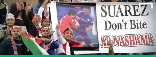 «ΣΟΥΑΡΕΖ, μην δαγκώσεις την Αλ Νασάμα» συνοδευμένο με φωτογραφία του Ουρουγουανού να δαγκώνει τον Ιβάνοβιτς της Τσέλσι στην περίφημη φάση μεταξύ των δύο παικτών.