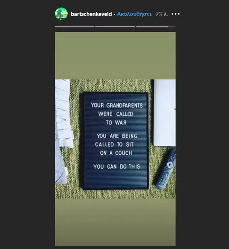 «Τους παππούδες σας τους καλούσαν στον πόλεμο. Εσάς σας καλούν να καθίσετε σε έναν καναπέ. Μπορείτε να το κάνετε», έγραψε σε story στο Instagram ο Ολλανδός στόπερ του Παναθηναϊκού.