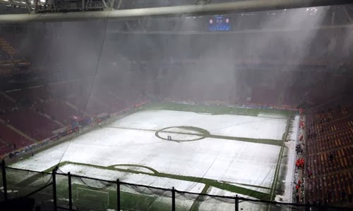 Η έδρα της Γαλατασαράι που θα φιλοξενούσε χθες το ματς με τη Γιουβέντους ντύθηκε στα λευκά με αποτέλεσμα να σταματήσει το παιχνίδι και η τύχη του να κρίνεται σήμερα, από λεπτό σε λεπτό.