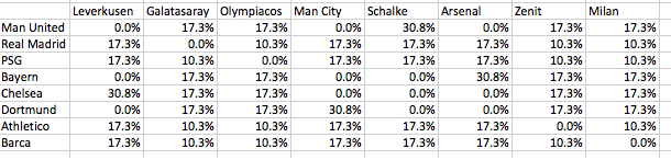 Το υψηλότερο ποσοστό «ανταμώματος», 30,8%, συναντάται για τρία ζευγάρια: Λεβερκούζεν-Τσέλσι, Μάντσεστερ Σίτι-Ντόρτμουντ, Σάλκε-Μάντσεστερ Γιουνάιτεντ και Άρσεναλ-Μπάγερν.
