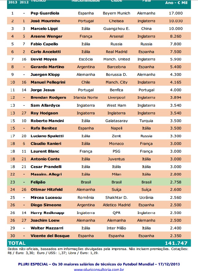 Σε αυτή τη λίστα, όπου βρίσκονται 30 προπονητές, οι περισσότεροι ανά χώρα είναι με καταγωγή από την Ιταλία, ενώ τα περισσότερα χρήματα ανά πρωτάθλημα δίνονται στην Premier League, καθώς στη λίστα υπάρχουν οκτώ προπονητές από το αγγλικό πρωτάθλημα.