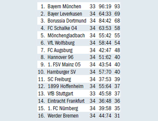 Το Kicker παρουσίασε τη συγκομιδή βαθμών των γερμανικών ομάδων μέσα στο τρέχον έτος και η Μπάγερν έστω και με αγώνα λιγότερο έχει 93 βαθμούς (με 30 νίκες και 3 ισοπαλίες), 24 περισσότερους από τη δεύτερη Λεβερκούζεν και 25 από την τρίτη Ντόρτμουντ.