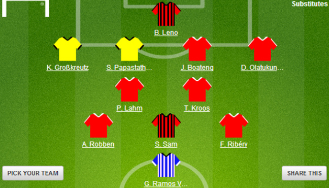 Λένο (Μπάγερ Λεβερκούζεν) – Γκρόσκροϊτς (Μπορούσια Ντόρτμουντ), Παπασταθόπουλος (Μπορούσια Ντόρτμουντ), Μπόατενγκ (Μπάγερν Μονάχου), Αλάμπα (Μπάγερν Μονάχου) – Λαμ (Μπάγερν Μονάχου), Κρόος (Μπάγερν Μονάχου) – Ρόμπεν (Μπάγερν Μονάχου), Σαμ (Μπάγερ Λεβερκούζεν), Ριμπερί (Μπάγερν Μονάχου) – Ράμος (Χέρτα).