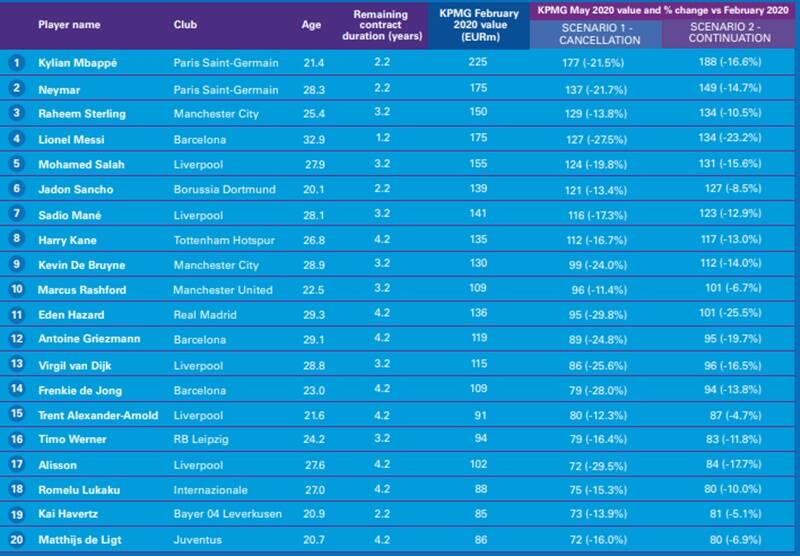 Σχετικά με τον αντίκτυπο στους κορυφαίους παίκτες, εξετάστηκε η τιμή της αγοράς σύμφωνα με τα δύο σενάρια και έχουν επιλέξει. Τις μεγαλύτερες απώλειες από τους πέντε κορυφαίους στην λίστα με τους top-20, καταγράφει ο Λιονέλ Μέσι, με 27,5% μείωση στο Σενάριο 1 (η αξία του φτάνει τα 127 εκατ. ευρώ) και 23,2% στο Σενάριο 2 (134). Τις μεγαλύτερες απώλειες στην εικοσάδα παρουσιάζει ο Εντέν Αζάρ (Ρεάλ Μαδρίτης, με 29,8 στο Σενάριο 1 (αξία 95 εκατ. ευρώ και 25,5% (101) στο Σενάριο 2.