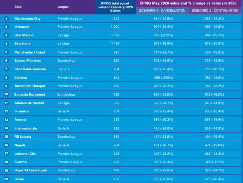 Τον Φεβρουάριο, η Λίβερπουλ, η Μπαρτσελόνα και η Ρεάλ Μαδρίτης είχαν επίσης ξεπεράσει αυτό το συμβολικό όριο. Στα δύο σενάρια, Μπαρτελόνα και Ρεάλ Μαδρίτης είναι οι σύλλογοι που παρουσιάζουν την υψηλότερη πτώση, μαζί με την Νάπολι. Η Μπαρστελόνα είχε τη μεγαλύτερη μείωση στο Σενάριο 1 (-28,9%) και λόγω του συμβολαίου του Μέσι που λήγει τον Ιούνιο του 2021.