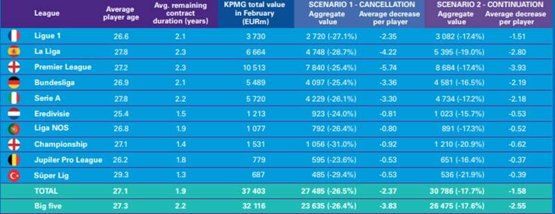 Και στα δύο σενάρια, τα μεγάλα πέντε τα πρωταθλήματα φέρουν το μεγαλύτερο μέρος αυτής της μείωσης στις αξίες των παικτών τους, με συνολικά 8,5 δισεκατομμύρια ευρώ στο σενάριο 1 και 5,6 δισεκατομμύρια ευρώ το Σενάριο 2. Συνολικά, οι παίκτες με μακροπρόθεσμα συμβόλαια έχουν δει μικρότερη μείωση της αξίας τους, ενώ οι νεότεροι παίκτες και οι σούπερ σταρ έχουν ήταν επίσης πιο ανθεκτικοί στις πτώσεις της αξίας τους.