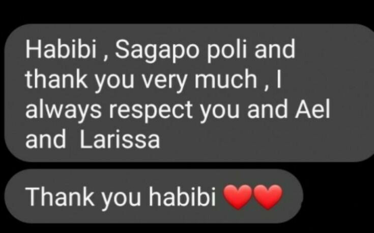 «Habibi, σ’ αγαπώ πολύ και σε ευχαριστώ πάρα πολύ, πάντα σέβομαι εσένα, την ΑΕΛ και τη Λάρισα», αναφέρει το ένα, «ευχαριστώ habibi», έγραφε στο άλλο.